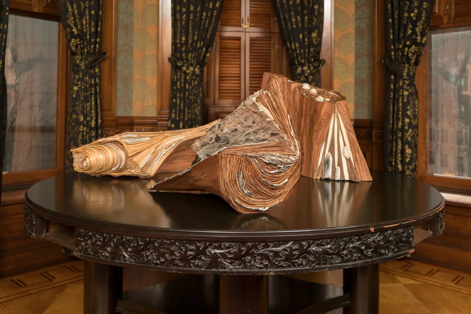 Barbara Cooper, Unbound , 2025. Wood veneer, books, paper. Installation view: “A Tale of Today: Materialities,” Driehaus Museum, Chicago, IL, February 7 - April 27, 2025.